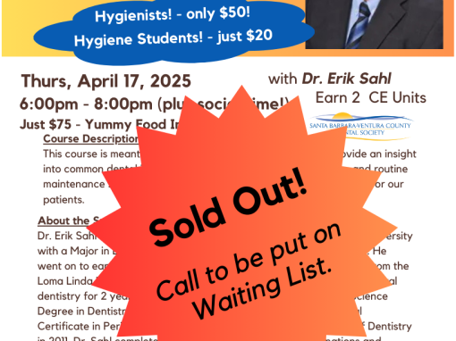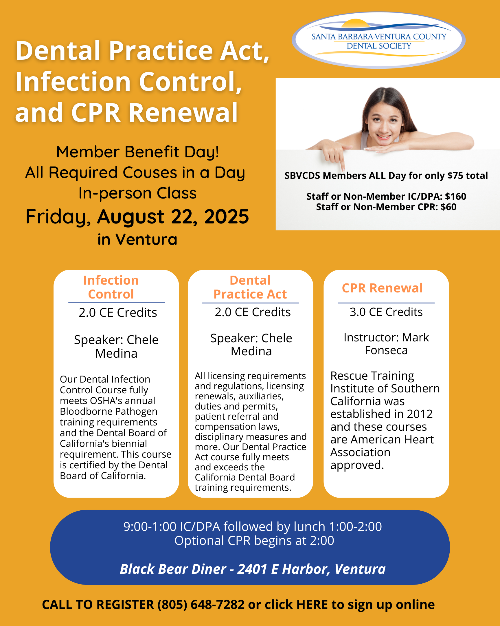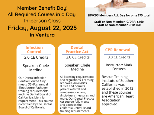 CPR Re-certification through American Heart Association for member dentists and staff with current CPR Card. Call for details! (805) 648-SBVC (7282)