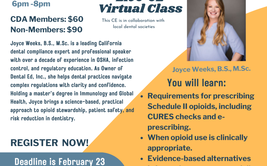 SEMINAR SYNOPSIS: -This course satisfies the 2 CE unit requirement made effective by the Dental Board of California for license renewal effective January 1, 2023. -Presented jointly by Local Dental Societies Fees: CDA Members: $60 Non-CDA Members: $90 Course...